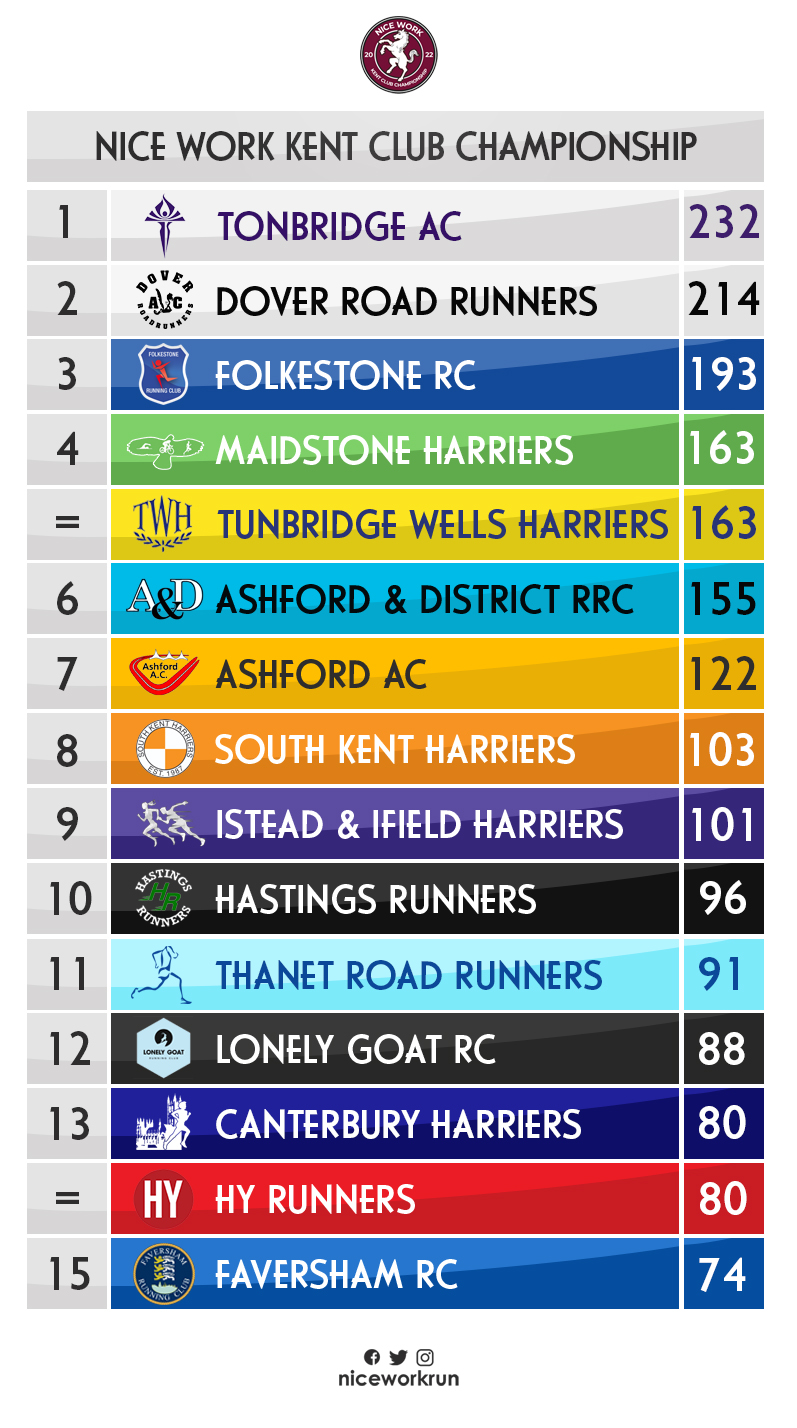 Despite the name, clubs from any county can enter the Club Championship, however only races that take place with a Kent postcode count towards the point system. This will be any race on the Nice Work website with Kent in the location.