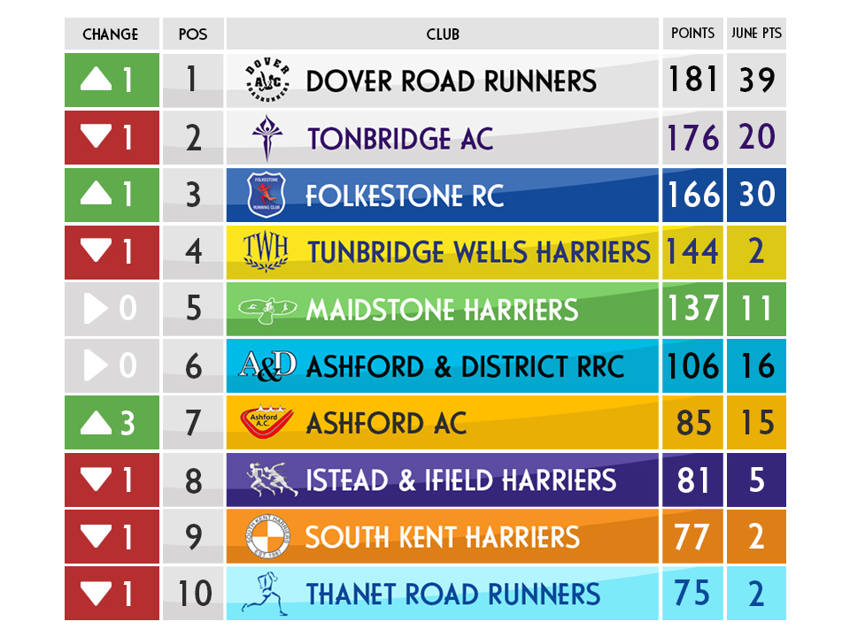 In other news across the competition, it was a quiet month for Tunbridge Wells Harriers as they slipped down into fourth place after looking like genuine title contenders just a couple of months ago. Ashford & District had a strong month and have now reached the 100 point club, just the sixth club to do so, thanks to a promising evening at the Ashford Striders Charing 10k. Ashford AC made the biggest strides of the month with a move from 10th place up to 7th after scoring 15 points in the month. Faversham, Lonely Goat and Canterbury Harriers will all be hopeful they can break into the top 10 in the final month. |